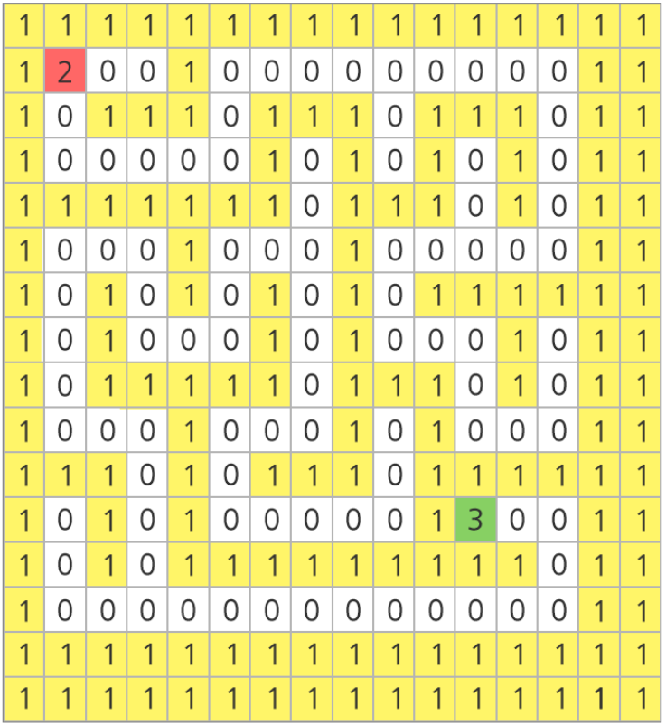아래 그림과 같은 미로가 있다. 16*16 행렬의 형태로 만들어진 미로에서 흰색 바탕은 길, 노란색 바탕은 벽을 나타낸다.